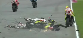 O 24χρονος Marco Simoncelli εχασε την ζωη του οταν στην επαφη που ειχε με τον Colin Edwards αλλα και με τον κολλητο του Valentino Rossi εχασε τον ελεγχο της μηχανης του και εσυρθει στο οδοστρωμα της πιστας...